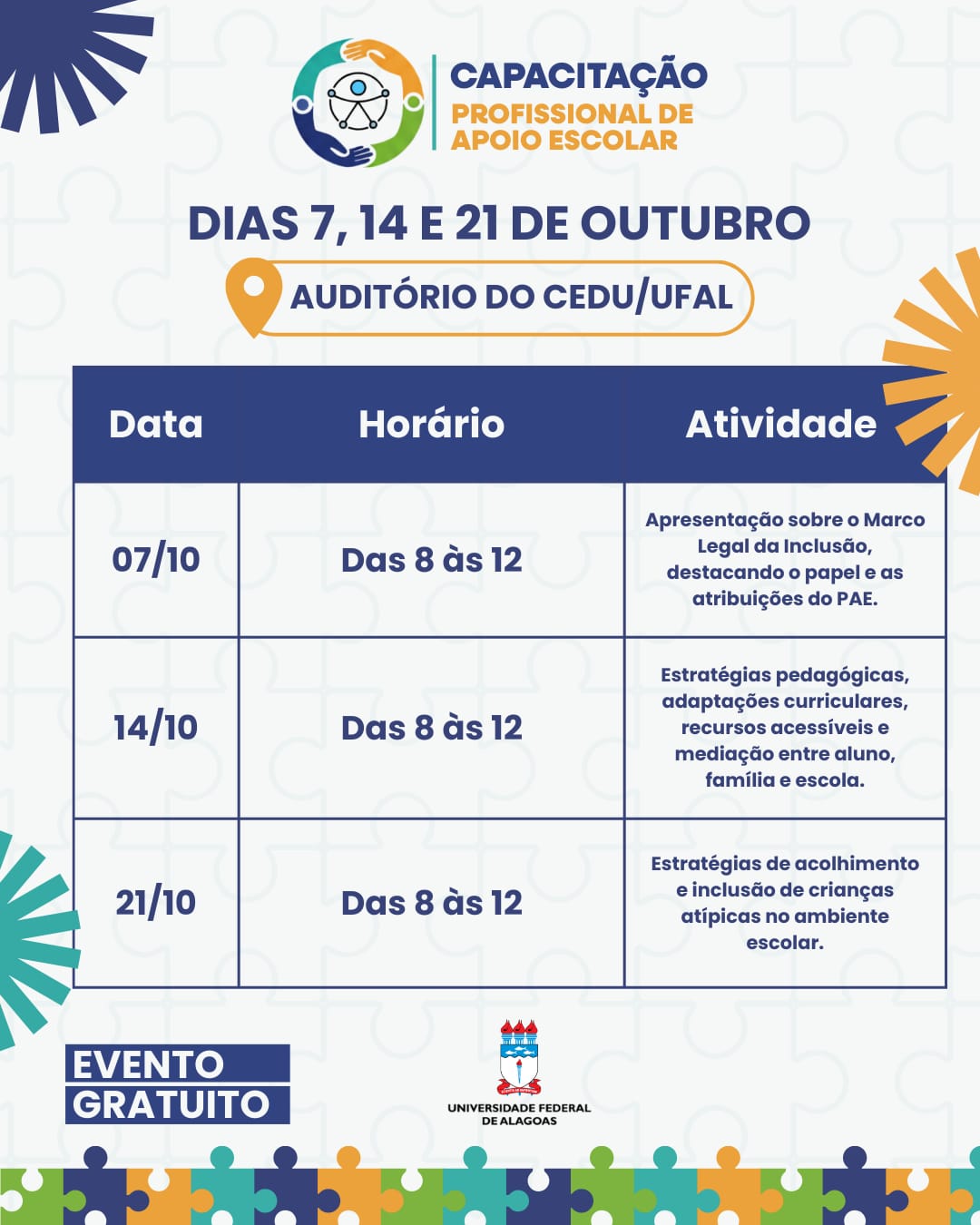 O Centro de Educação (Cedu) da Universidade Federal de Alagoas (Ufal) está com inscrições abertas para a Capacitação Profissional de Apoio Escolar (PAE). Os encontros formativos acontecerão nos dias 7, 14, 21 e 24 de outubro, no Campus A.C. Simões, em Maceió. A ação é integrada e ocorre nos três turnos, permitindo que o público se inscreva e participe das atividades pela manhã, tarde ou noite, mediante preenchimento dos formulários online disponíveis para cada período.
