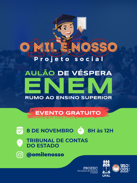“Convido os estudantes que irão fazer o Enem para o aulão do projeto “O mil é nosso”, preparado com muito carinho para revisar, aprender e se motivar na reta final! É o momento para tirar dúvidas, aprender estratégias que funcionam e ter aquele empurrãozinho de confiança que falta antes da prova”, convida Livia Soares, técnica em Assuntos Educacionais da Universidade Federal de Alagoas (Ufal) e coordenadora do projeto.