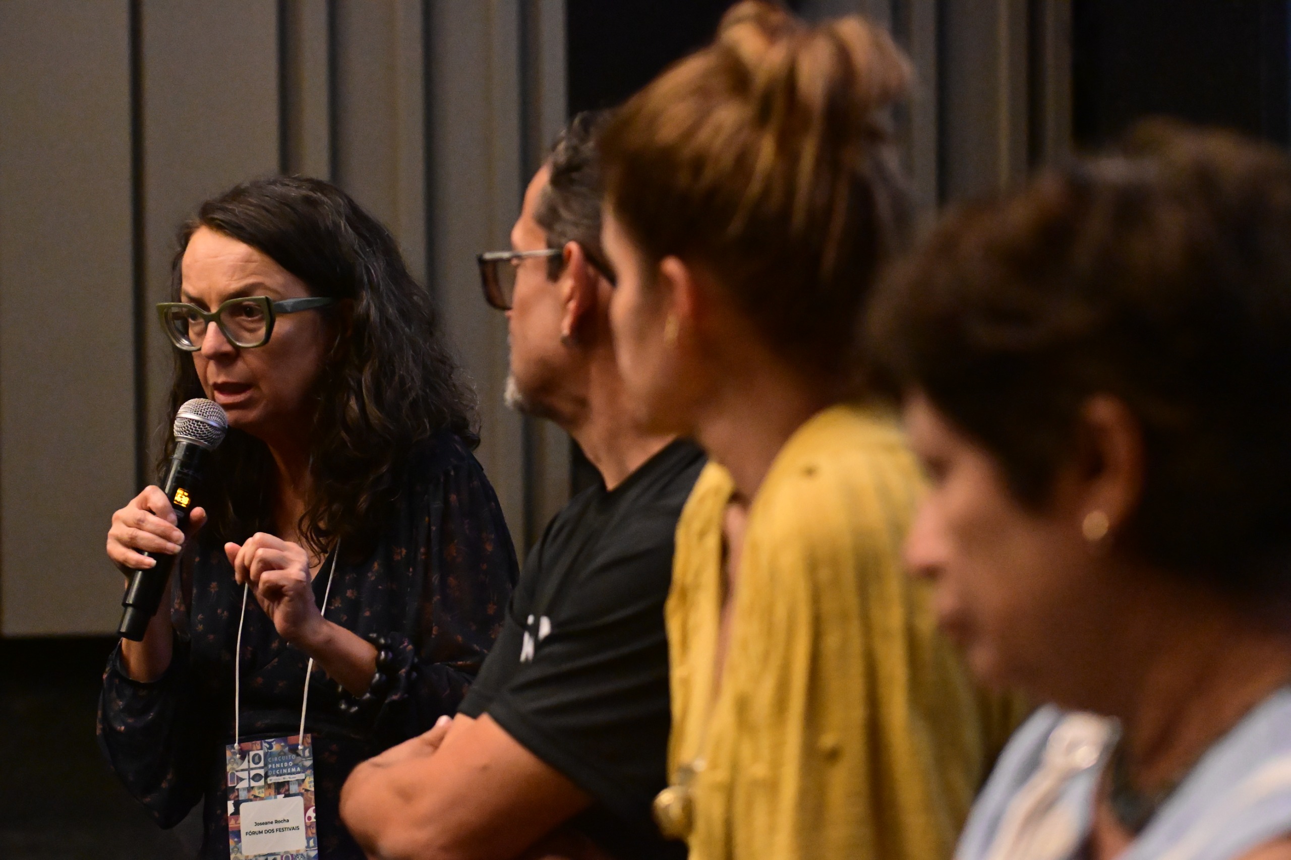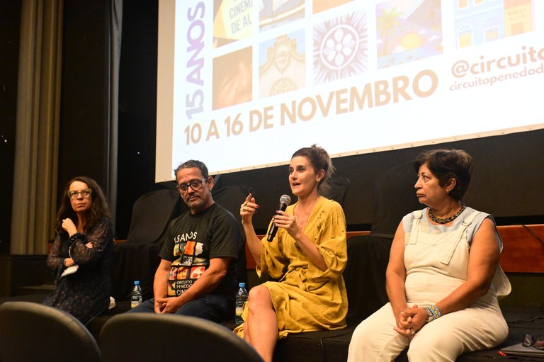 O debate “Curadoria, Programação e Exibição: A Importância dos Festivais com as Audiências” foi mediado por Josiane Osório, presidente do Fórum Nacional dos Festivais, e contou com a participação de Rosângela Rocha, diretora do Festival Curta-SE, de Sergipe, e gestora do Cine Walmir Almeida; Simone Zuccolotto, diretora, roteirista e integrante da comissão de seleção do Oscar 2026; e Sérgio Onofre, coordenador geral do Circuito Penedo de Cinema.