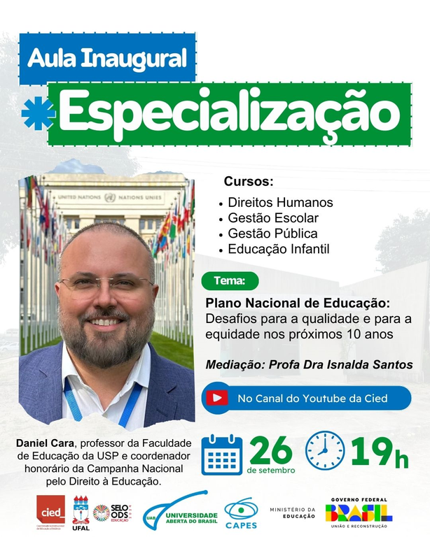 A Universidade Federal de Alagoas (Ufal) realiza, na sexta-feira (26), às 19h, a aula inaugural dos cursos de especialização da Universidade Aberta do Brasil (UAB). O encontro acontece por meio do canal da Coordenadoria Institucional de Educação a Distância (Cied) no YouTube e contará com a palestra ‘Plano Nacional de Educação: desafios para a qualidade e para a equidade nos próximos 10 anos”, ministrada pelo professor Daniel Cara, da Faculdade de Educação da Universidade de São Paulo (USP). A mediação será feita pela professora Inalda Santos.
