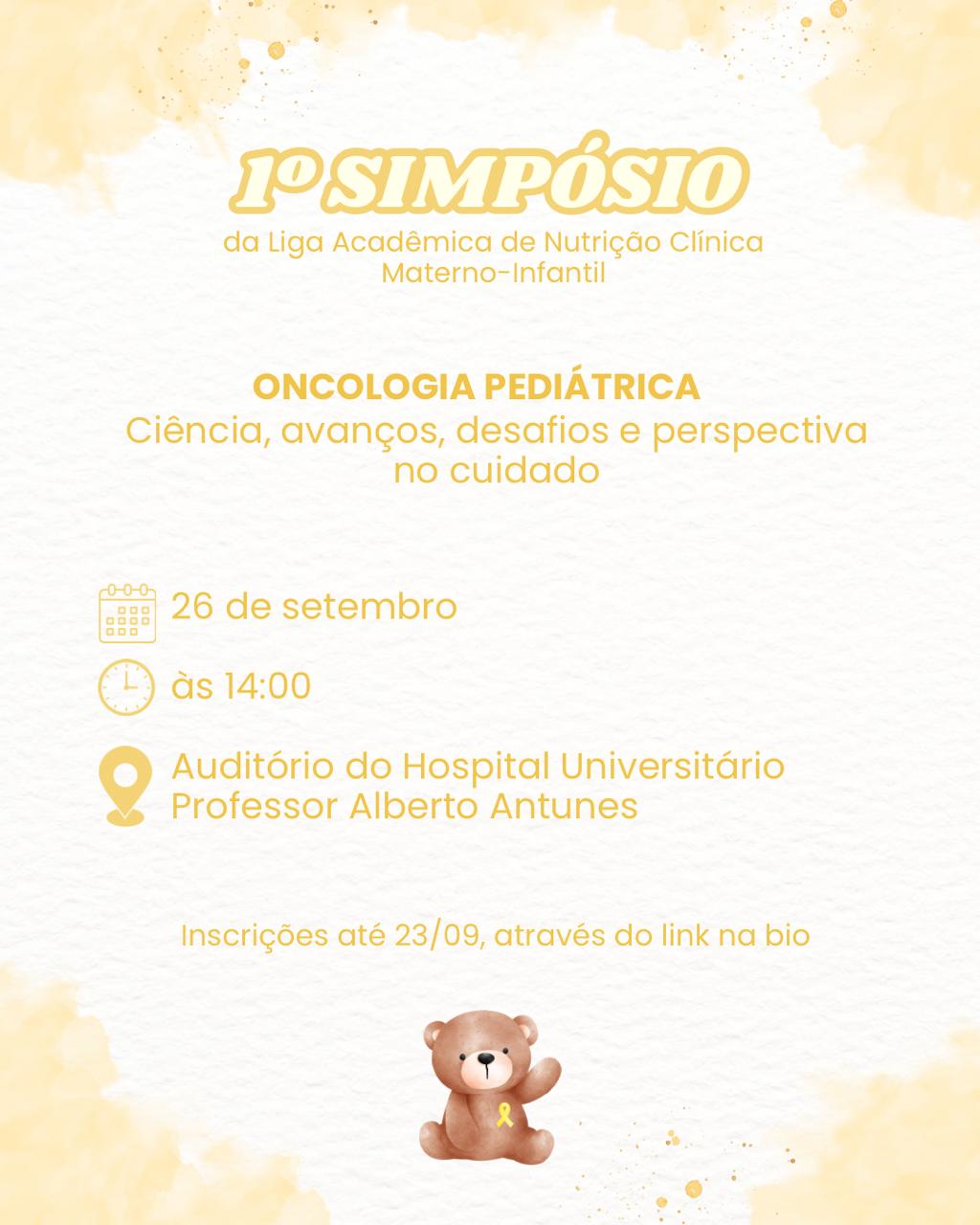O 1° Simpósio da Liga Acadêmica de Nutrição Clínica Materno Infantil (Lancmi) será realizado no dia 26 de setembro, no auditório do Hospital Universitário (HU) da Ufal. O tema principal do evento é Oncologia Pediátrica: Ciência, avanços, desafios e perspectiva no cuidado.