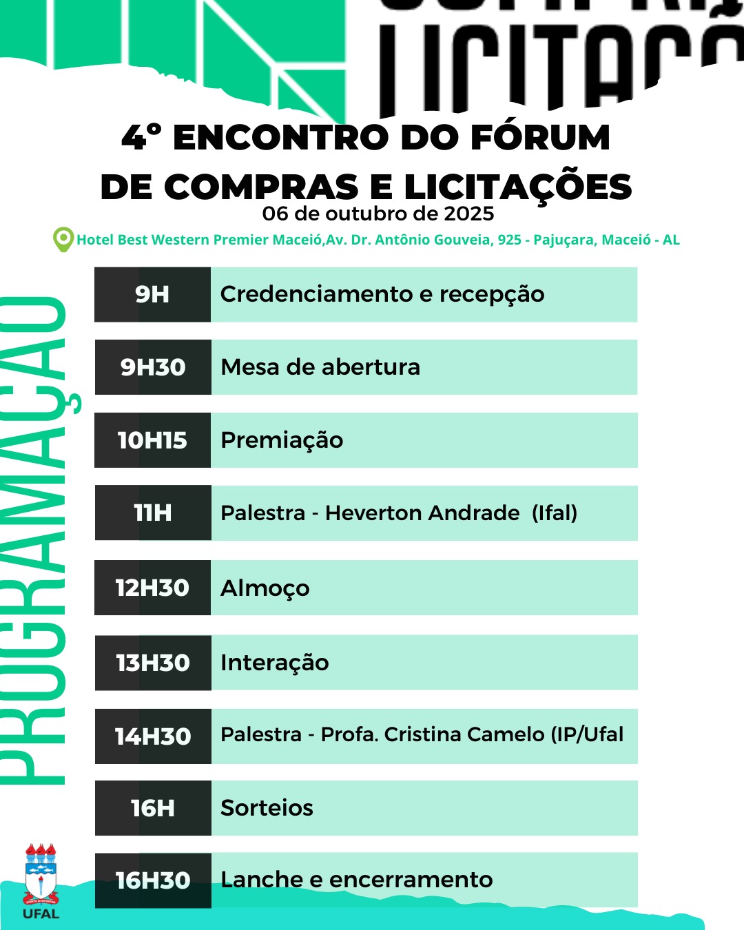 Na segunda-feira (6), será realizado o 4º Encontro do Fórum de Compras e Licitações, no Hotel Best Western Premier Maceió, na Pajuçara, destinado a requisitantes de unidades acadêmicas e administrativas, membros das comissões permanentes de materiais e equipamentos, além dos setores de compras da Ufal, incluindo os campi fora de sede. A inscrição pode ser feita aqui.