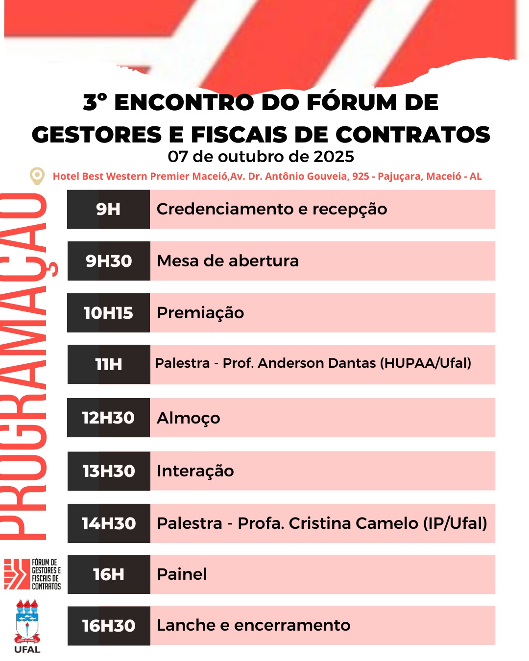 Na terça-feira (7), é a vez do 3º Encontro do Fórum de Gestores e Fiscais de Contratos, que acontecerá também no Hotel Best Western Premier Maceió, na Pajuçara, para servidores que atuam nas áreas destinadas aos contratos. As inscrições podem ser feitas aqui.