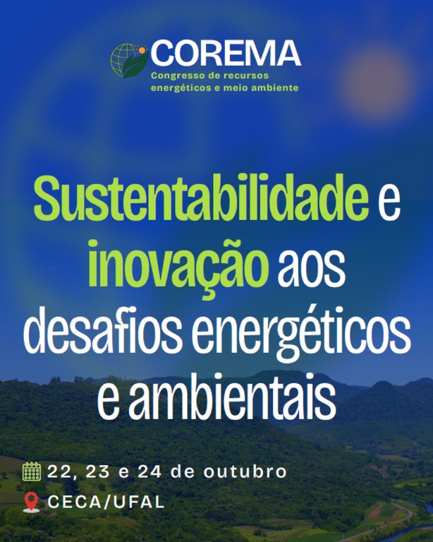A terceira edição do Congresso de Recursos Energéticos e Meio Ambiente (Corema 2025) acontecerá nos dias 22, 23 e 24 de outubro, no Campus de Engenharias e Ciências Agrárias (Ceca) da Universidade Federal de Alagoas (Ufal), em Rio Largo (AL). Realizado em edições anteriores em 2021 e 2023, o Corema é voltado para estudantes, profissionais e pesquisadores da área do setor energético e áreas afins.