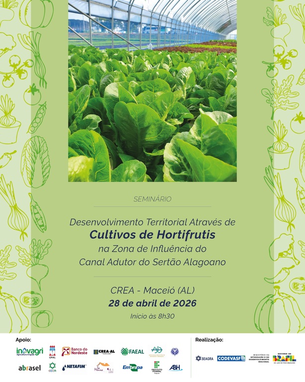 O Canal Adutor do Sertão Alagoano é uma das maiores infraestruturas hídricas do Brasil e deve ampliar a oferta de água para abastecimento humano e irrigação, beneficiando mais de 1 milhão de pessoas em 42 municípios do semiárido de Alagoas. O seminário “Desenvolvimento Territorial por meio de Cultivos de Hortifrutis na Zona de Influência do Canal Adutor do Sertão Alagoano” trará ao debate público temas como a seleção de áreas para projetos de irrigação, a classificação de solos na região, tecnologias para produção de hortifrutis e novos modelos de perímetros irrigados. Também vai debater as tecnologias sociais hídricas, linhas de crédito e operações na região do projeto, além da demanda do setor de hotéis, bares e restaurantes por esses produtos. O evento tem o apoio da Ufal.
