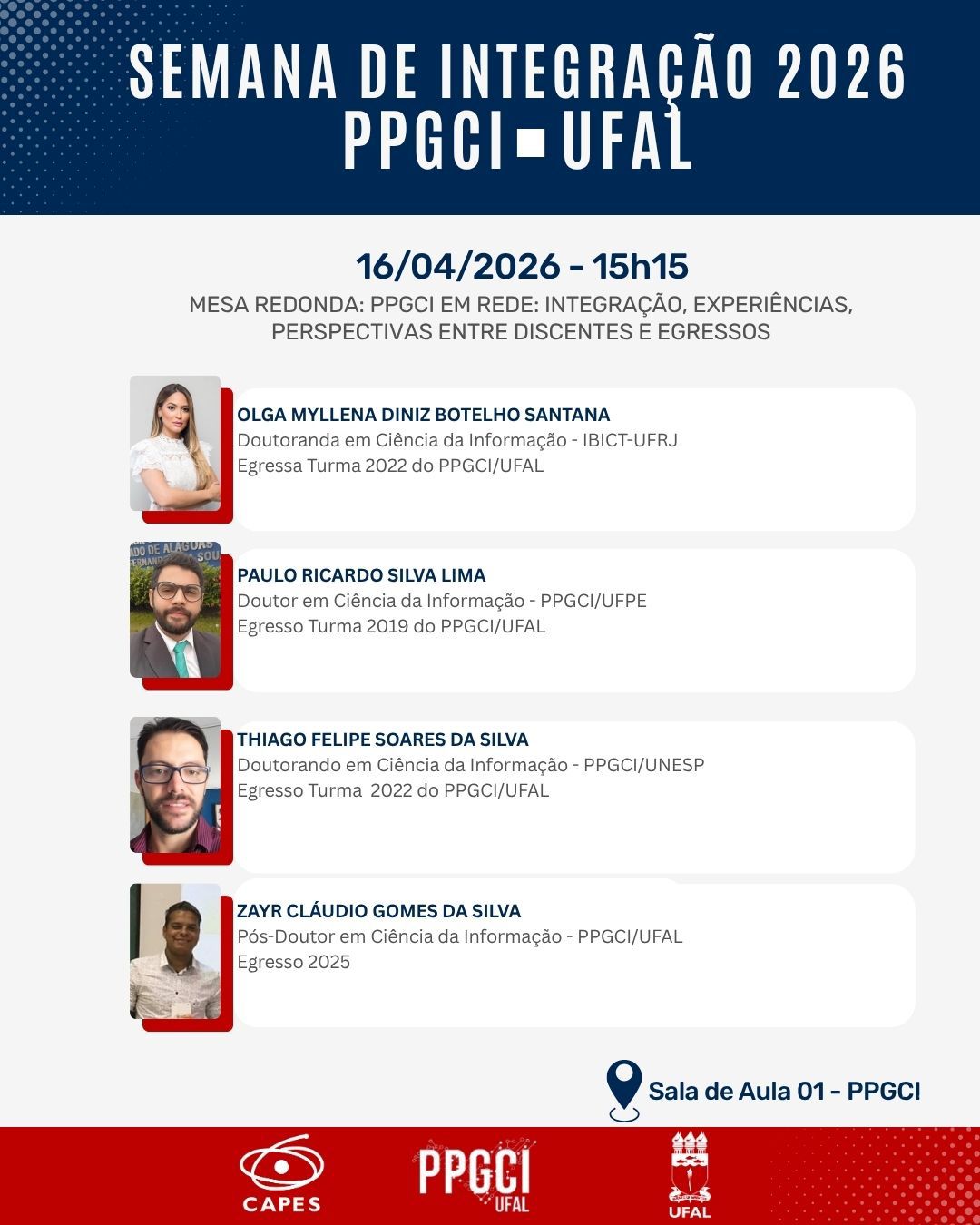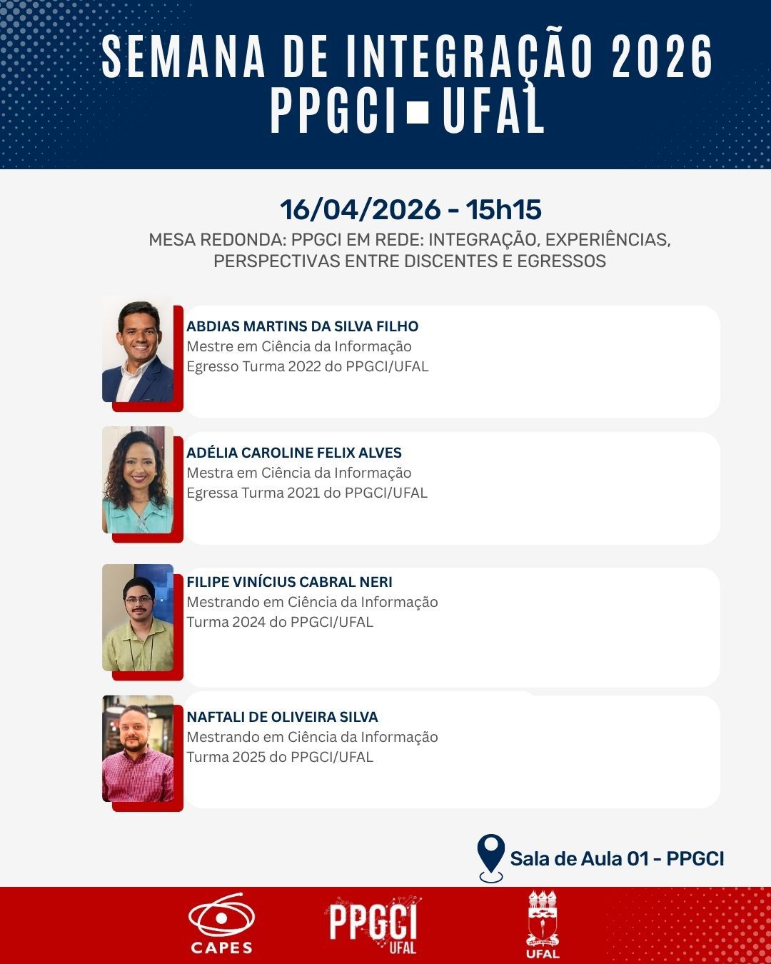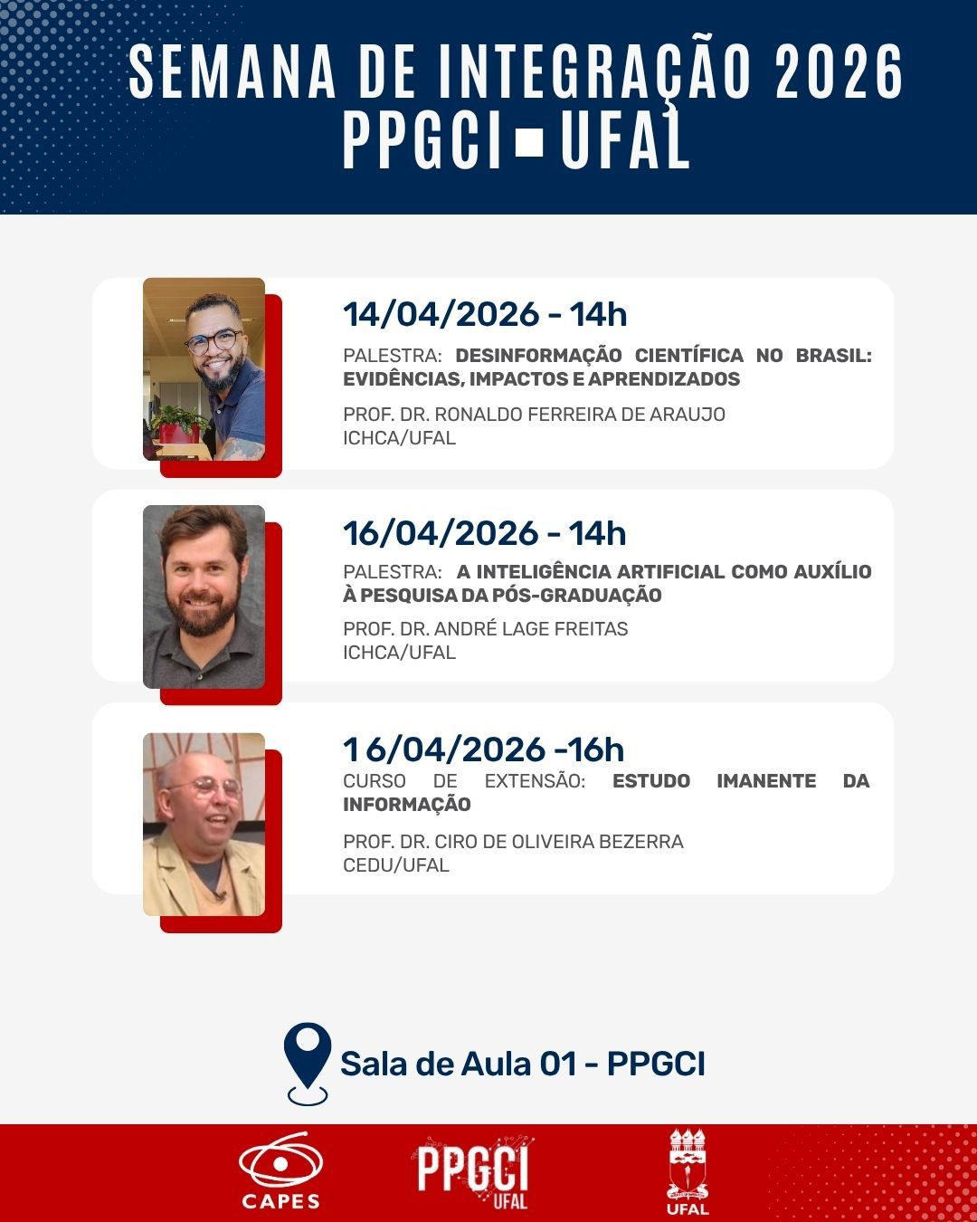 No dia 14, o professor Ronaldo Araújo (Ichca/Ufal) ministrará a palestra Desinformação científica no Brasil: evidências, impactos e aprendizados. No dia 16, a programação continua com a palestra A inteligência artificial como auxílio à pesquisa na pós-graduação, proferida pelo professor André Lage (Ichca/Ufal). Em seguida, discentes e egressos do PPGCI participarão de uma mesa redonda focada na partilha de vivências acadêmicas e profissionais.