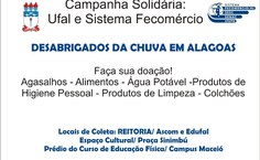 A Ufal e o Sistema Fecomércio/ Sesc/ Senac lançam a Campanha Solidária para ajudar aos mais de 50 mil desabrigados e desalojados no Estado de Alagoas, depois das enchentes que provocaram uma tragédia em 21 municípios. Segundo registros da Defesa Civil Estadual, 19 pessoas morreram e mais de mil estão desaparecidas. Cerca de 70 mil pessoas estão desabrigadas.