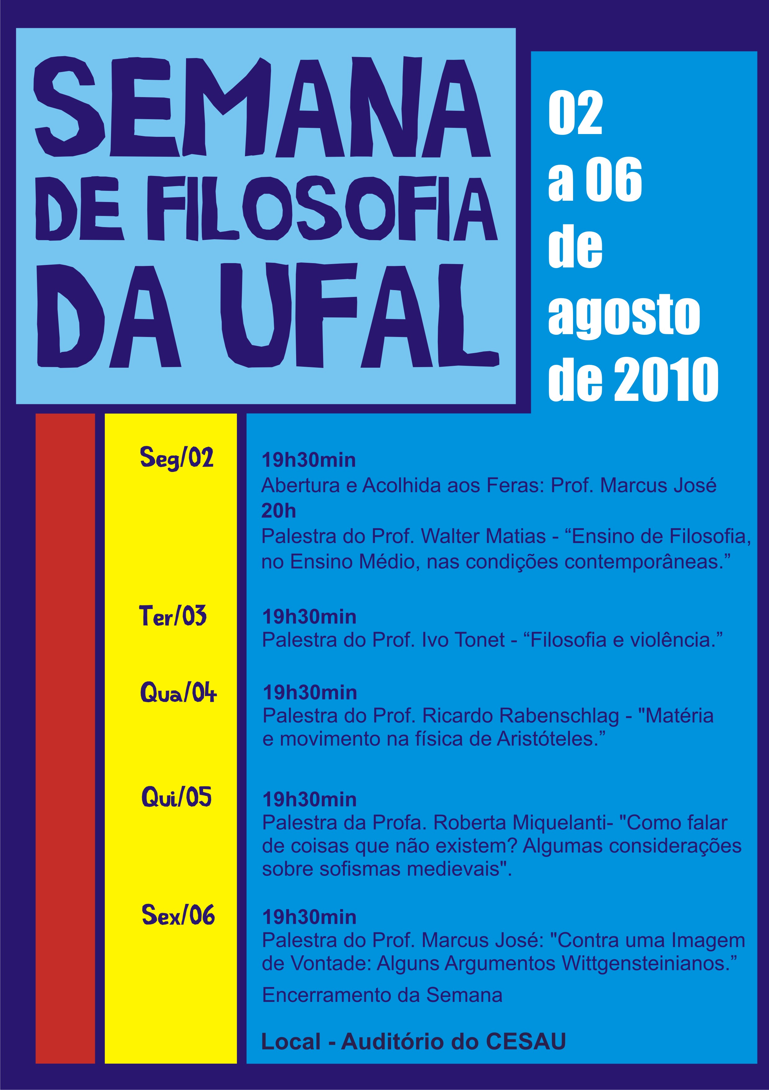 A Semana de Filosofia, será realizada entre os dias 2 e 6 de agosto, no auditório da Faculdade de Medicina. A proposta é realizar um evento de início de semestre apenas com palestras dos professores do curso. Além de dar oportunidade para alguns professores novos apresentarem-se para os integrantes do curso, a Semana pretende, sobretudo, ser um momento dos professores partilharem suas reflexões e pesquisas. Com este evento, pretende-se também acolher aos novos alunos da maneira mais adequada para um curso de Filosofia: refletindo.