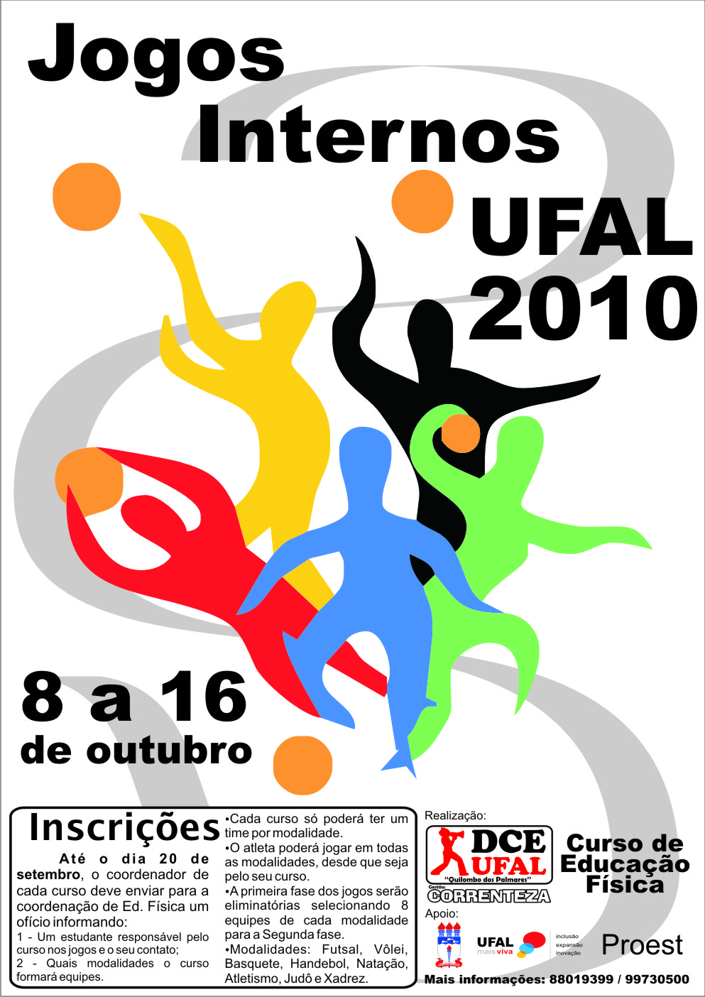 As inscrições para os Jogos Internos estão abertas até o dia 10 de setembro na Secretaria do curso de Educação Física. É necessário um ofício do Curso indicando as modalidades esportivas de interesse. As modalidades são: atletismo, basquetebol, futsal, handebol, judô, natação, voleibol e xadrez. Todas as modalidades serão oferecidas nos segmentos feminino e masculino. As inscrições nominais por modalidade serão informadas logo após o encerramento das inscrições das equipes. Na modalidade que exceder o número de 8 equipes, haverá uma eliminatória ainda no mês de setembro. Os jogos acontecem de 8 a 16 de outubro.