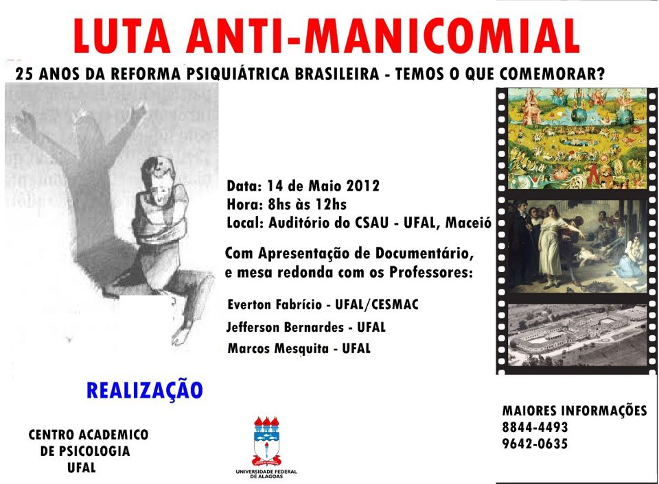 Na segunda-feira, 14 de maio, às 8h, no auditório do antigo Csau, o Centro Acadêmico de Psicologia reúne estudantes e professores para debater os 25 anos de luta antimanicomial. Durante o evento, será apresentado documentário sobre o tema, seguido de debate com os professores Everton Fabrício, Jeferson Bernardes e Marcos Mesquita. As inscrições podem ser feitas no local.