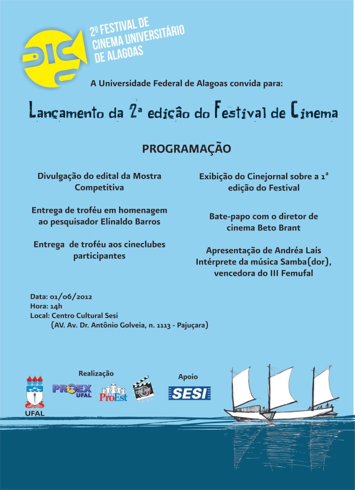 O lançamento da 2ª edição do Festival Universitário de Cinema de Alagoas será nesta sexta-feira, 1 de junho, às 14h, no Centro Cultural Sesi. A programação contará com a participação do diretor de Cinema Beto Brant e a entrega de troféus ao pesquisador Elinaldo Barros e aos cineclubes participantes da primeira edição.