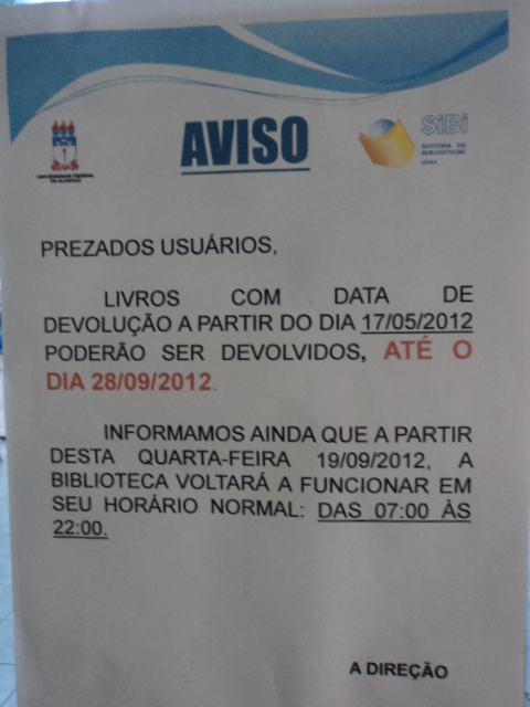 Os estudantes que estiverem pensando em fazer agendamento de livros na Biblioteca Central terão que esperar um pouco mais. De acordo com David, as reservas dos exemplares voltarão a ser feitas apenas a partir do dia 1 de outubro, depois que todos os livros emprestados durante o período de greve forem devolvidos.