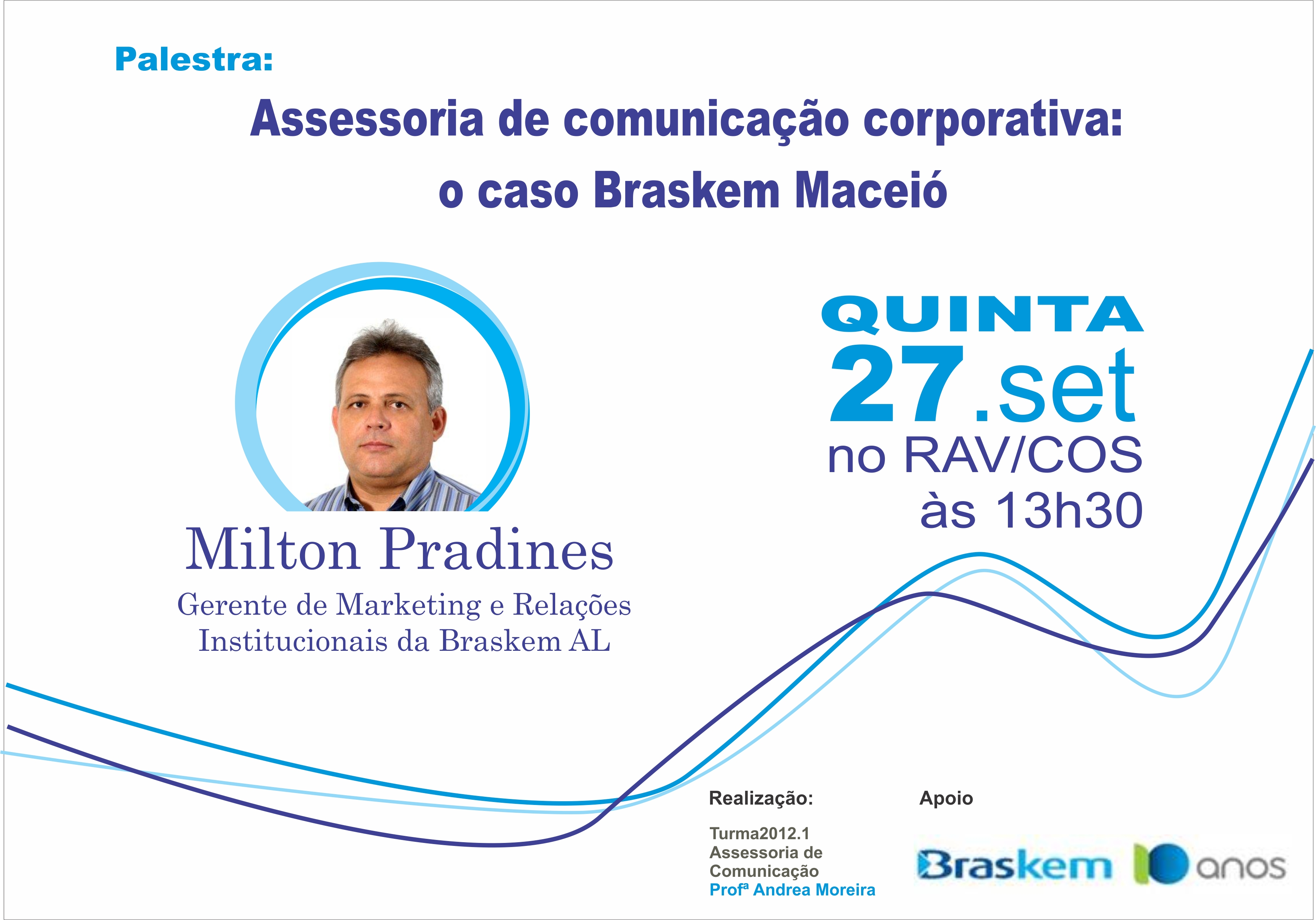 Com a palestra intitulada “Assessoria de Comunicação Corporativa: o caso Braskem Maceió”, Pradines pretende articular conhecimentos de áreas como comunicação social e administração, relatando suas experiências de sucesso à frente da assessoria de comunicação da empresa.