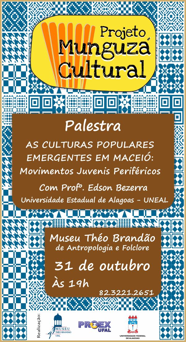 O Museu Théo Brandão de Antropologia e Folclore promove, na quarta-feira, 31, às 19h, o “Munguzá Cultural” com o tema “As culturas populares emergentes em Maceió: movimentos juvenis periféricos”. O palestrante é o professor da Universidade Estadual de Alagoas (Uneal), Edson Bezerra.