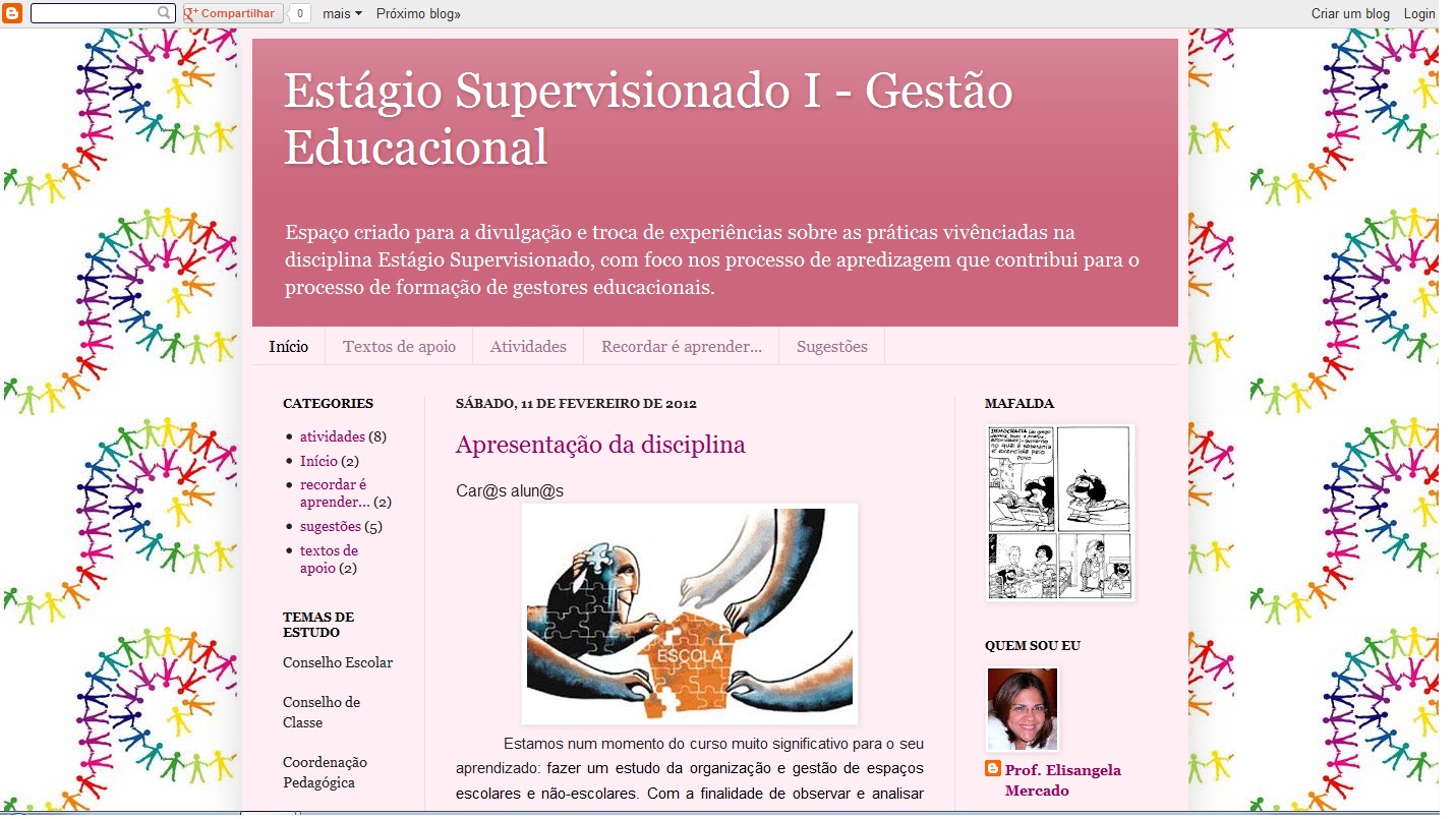 O relato de experiência de Elisângela foi sobre o uso do blog como ferramenta de aprendizagem, troca de experiências e saberes na disciplina Estagio Supervisionado I - Gestão educacional, nos 5º e 6º anos do curso de Pedagogia, no Centro de Educação (Cedu) da Ufal. O blog, que leva o nome da disciplina ministrada, foi tema de outro trabalho apresentado no Congresso Virtual Educa, no Panamá e além do caráter inovador e desafiador, apresentou um resultado significativo na inter-relação escola e universidade.
