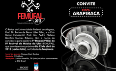 Depois do sucesso no Sertão de Alagoas, o festival chega ao Agreste do Estado. Arapiraca vai ser o cenário para as apresentações das canções “Unilateral”, “A Nova Lei”, “Agô”, “Sorriso Póstumo”, “Nada Vezes Nada”, “Recomeço”, “Bariloche” e “Uma Dose”, compostas e interpretadas por acadêmicos e servidores da Ufal. O evento é uma iniciativa da Pró-reitoria Estudantil (Proest) e tem como objetivo despertar, integrar e evidenciar talentos artísticos da comunidade universitária.