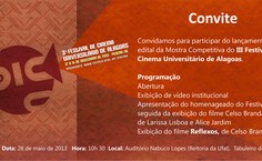A terceira edição do Festival de Cinema Universitário de Alagoas será lançada no próximo dia 28 de maio, às 10h30, no auditório Reitor Nabuco Lopes, localizado na Reitoria da Universidade Federal de Alagoas, no Campus A. C. Simões. Na ocasião, será apresentado o edital da Mostra Competitiva e o público assistirá à exibição de “Reflexos”, de Celso Brandão, homenageado do evento. O grupo Som do Beco encerrará a programação do lançamento, para animar o público com música de qualidade.