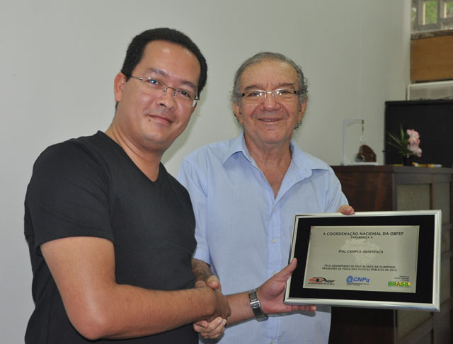 Nessa quinta-feira, 13, o Campus Arapiraca do Instituto Federal de Alagoas (Ifal) recebeu do Instituto de Física (IF), da Universidade Federal de Alagoas (Ufal), uma placa e medalha pelo desempenho obtido nas Olimpíadas Brasileiras de Física das Escola Públicas (OBFep). A premiação foi resultado da conquista de duas medalhas de ouro por dois de seus alunos de Ensino Médio.