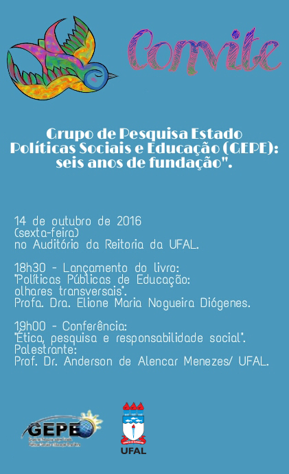 Para celebrar os seis anos de fundação, o Grupo de Pesquisa sobre Estado Políticas Sociais e Educação (GEPE), do Centro de Educação (Cedu), da Universidade Federal de Alagoas, promove na sexta-feira, 7 de outubro, atividades que contemplam debate e palestra, no auditório da Reitoria Campus A. C. Simões. O evento é aberto à comunidade e proporciona a oportunidade de comemorar a produção, sistematização e circulação de conhecimento no campo das políticas públicas educacionais.