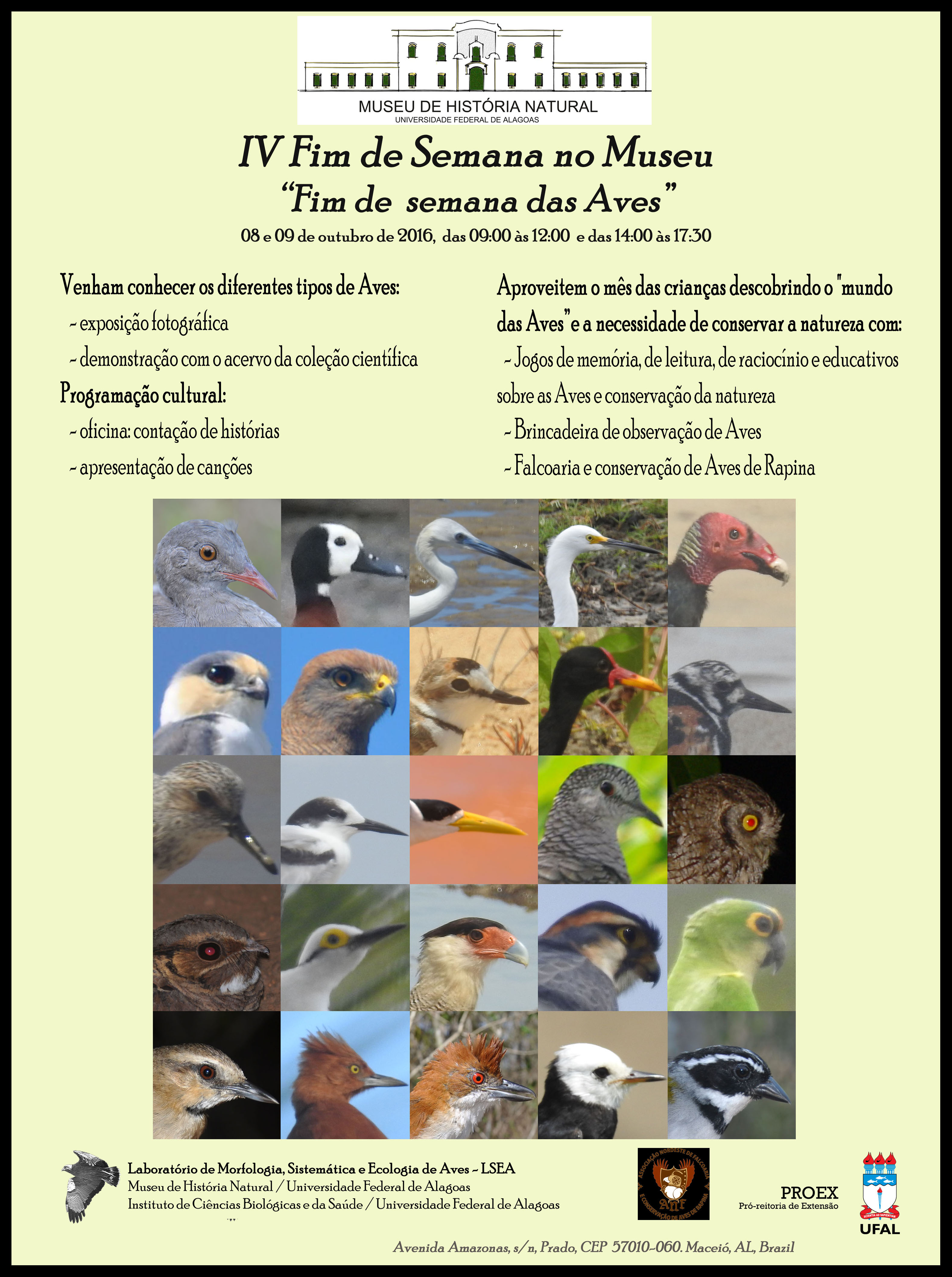 Nos dias 8 e 9 de outubro acontece o 4º Fim de Semana no Museu. O evento realizado pelo Museu de História Natural (MHN) da Universidade Federal de Alagoas (Ufal) conta com programação voltada ao desenvolvimento de práticas conservacionistas em relação às aves. Esta edição é organizada pelo Laboratório de Morfologia, Sistemática e Ecologia de Aves (LSEA) e o setor de Ornitologia do MHN.