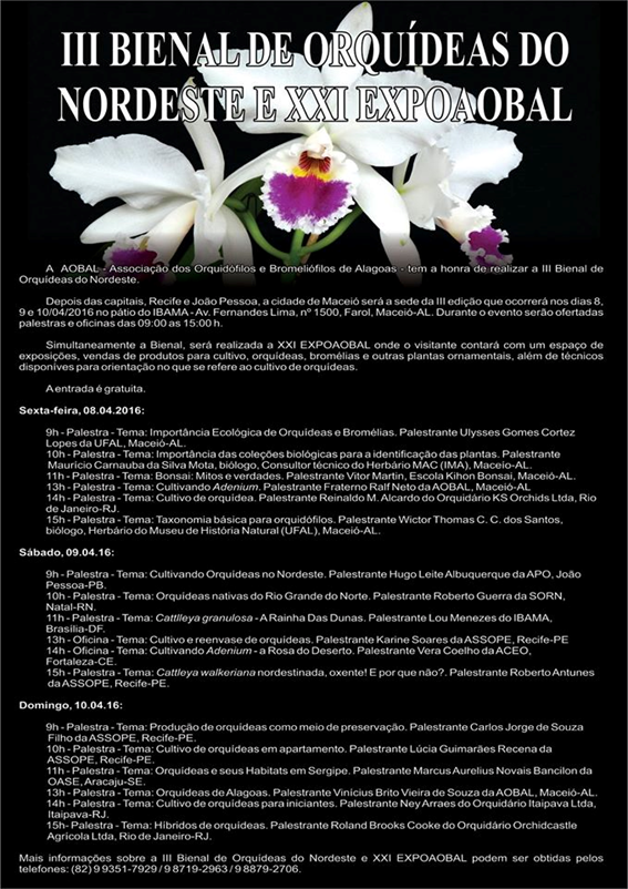 Nos dias 8, 9 e 10 de abril acontecerá a 3ª Bienal de Orquídeas do Nordeste. O evento organizado pela Associação dos Orquidófilos e Bromeliófilos de Alagoas (Aobal) será realizado na sede do Instituto Brasileiro do Meio Ambiente e dos Recursos Naturais Renováveis (Ibama) e contará com programação variada.