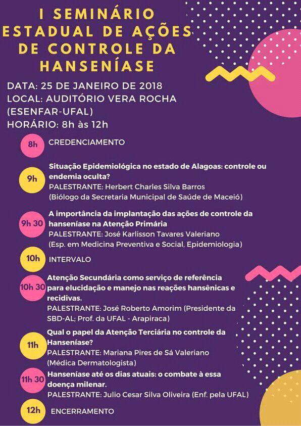 O evento será realizado no Auditório Vera Rocha (Esenfar/Ufal), das 8h às 12h. A programação contempla palestras e debates sobre a situação epidemiológica de Alagoas, a história da hanseníase e a organização dos serviços de saúde para a sua assistência na atenção primária, secundária e terciária.