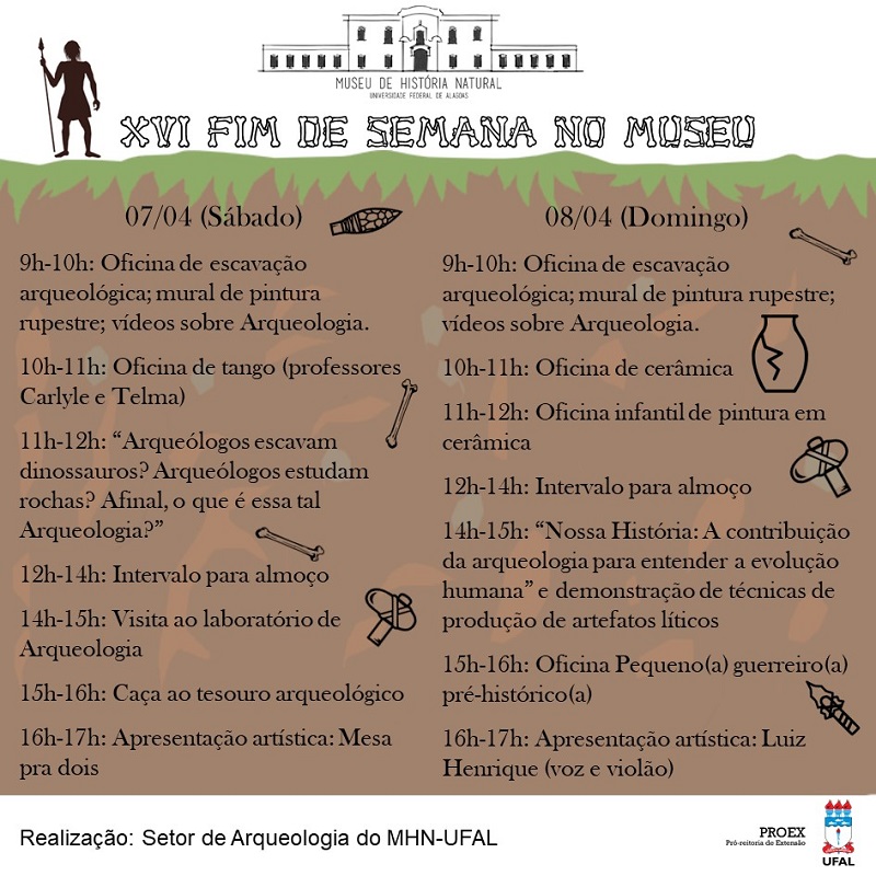 Nos dias 7 e 8 de abril, o Museu de História Natural (MHN) da Universidade Federal de Alagoas (Ufal) realiza a 16ª edição do Fim de Semana no Museu. O evento será conduzido pelo setor de Arqueologia, que traz atrações voltadas para aproximar o público a esta área e mostrar como os profissionais contribuem para o conhecimento da história da região.