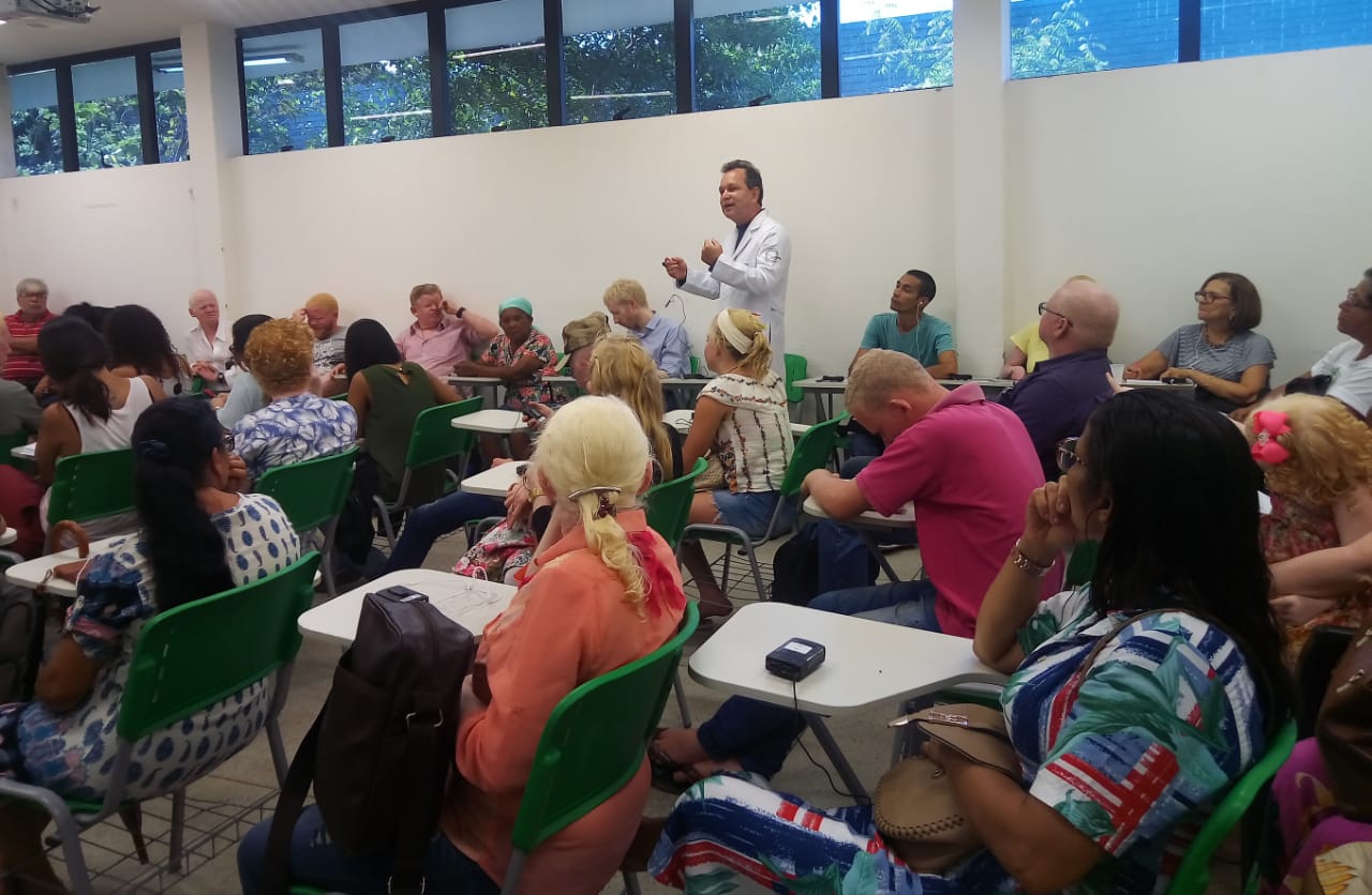 Antes de abrir para as explanações e perguntas das platéia, um representante da Albinal, José Passos apresentou um trabalho onde mostrava um pouco da realidade enfrentada pela pessoa albina em Alagoas, preconceitos, bullyng, falta de informação sobre o assunto e da dificuldade enfrentada principalmente no mapeamento de pessoas com albinismo, já que o IBGE rejeitou a inclusão desse dado no censo de 2020. Falou da Lei 6.605/2017 Maceió, que garante a distribuição de protetor solar, além da garantia de oftalmologista e dermatologista para pessoas albinas, com atendimentos no CER/Pam salgadinho, porém ainda encontra muita dificuldade numa distribuição mais massiva dos produtos. Citou também o fato da lei 7.762/2014 que Institui a Política Nacional de Proteção dos Direitos da Pessoa com Albinismo, no momento ela se encontra parada, porém como ele mesmo falou “quem sabe agora com a visita da Ero esse projeto não vai para frente.”