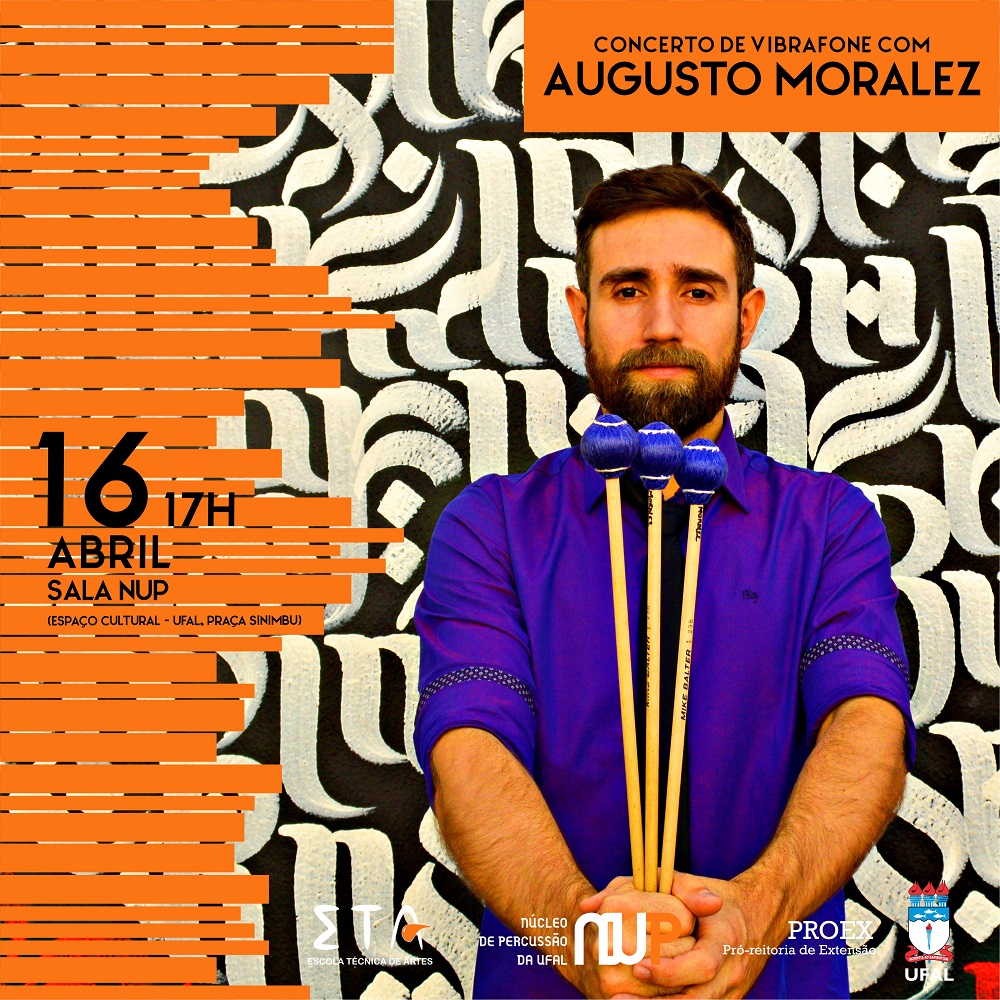 O Núcleo de Percussão (NUP), equipamento cultural da Universidade Federal de Alagoas, apresenta três concertos de Vibrafone, com Augusto Moralez, professor da Escola Técnica de Artes. Esses recitais serão uma espécie de esquenta para o percussionista se preparar para a turnê que fará nos Estados Unidos, em abril deste ano.