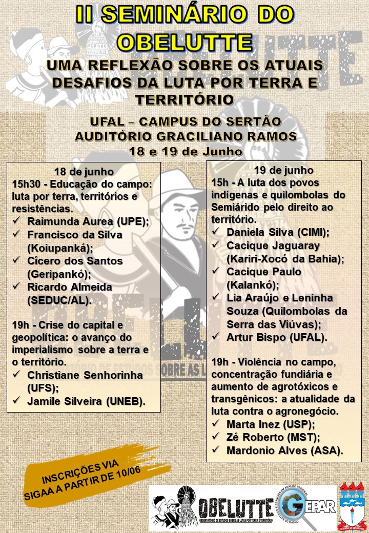 Segundo a organização, o intuito do evento é discutir sobre educação e violência do campo envolvendo, principalmente, povos indígenas e quilombolas, bem como a crise do capital e geopolítica. O seminário tem como tema Uma reflexão sobre os atuais desafios da luta por terra e território e está vinculado ao Grupo de Estudos e Pesquisas em Análise Regional, que tem se notabilizado pelas pesquisas sobre estrutura fundiária, sementes, conflitos no campo, indígenas e quilombolas no semiárido de Alagoas.