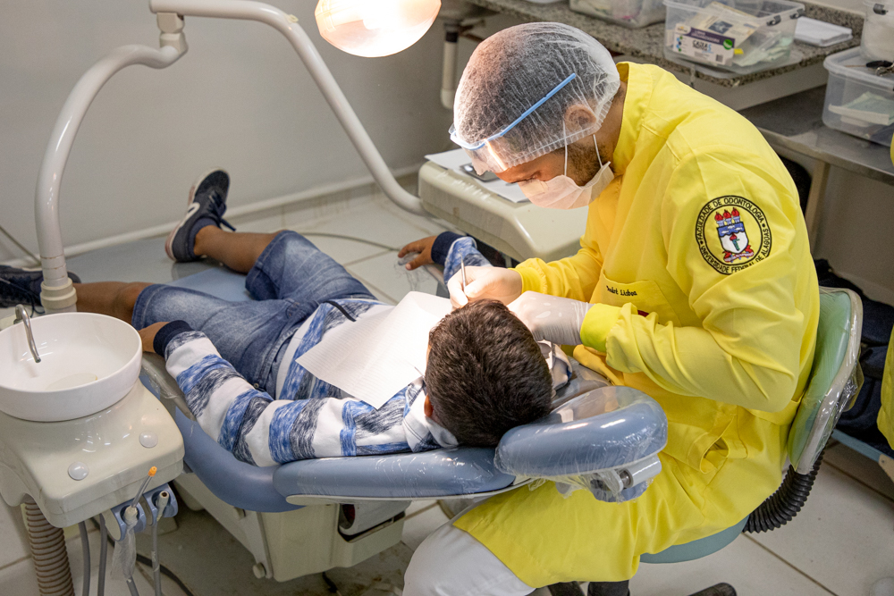 “Recuperamos a autoestima do paciente, muitos chegam com cáries, dentes feios, resto de raízes. Aqui, fazemos restauração, extração, canal, recuperamos coroas, enfim, a boca do paciente. Em cada setor tem professor acompanhado de cada especialidade. Temos docentes de cirurgia, dentística [restaurações], endodontia [tratamento de canal], professores de prótese, e periodontia [gengiva]”, elenca.