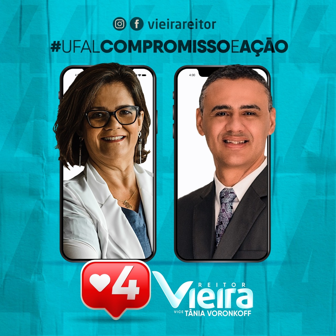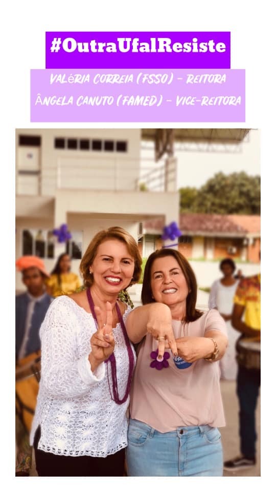 Chapa 2: Temos dito, ao longo desses anos, que somos todos Ufal, porque, de fato, somos! A realidade tem sido difícil e não se apresenta um cenário de que ela será mais branda. Ao contrário! A nossa experiência me deixou mais preparada para o enfrentamento ao autoritarismo, à possibilidade de cobranças nas universidades, ao elitismo, às ameaças à liberdade de cátedra, ao desmonte da pesquisa. Nessa conjuntura, a universidade precisa ter, junto à sua comunidade, representantes que sejam sensíveis às demandas e estejam na vanguarda do aprofundamento da democracia, da inclusão social, da liberdade de pensamento, da gratuidade na graduação e pós-graduação, da captação de recursos para a realização de projetos estruturantes comprometidos, sempre, com os interesses da maioria da população. Temos a convicção que o nosso projeto de gestão representa a resistência e o fortalecimento da universidade democrática, pública e gratuita.