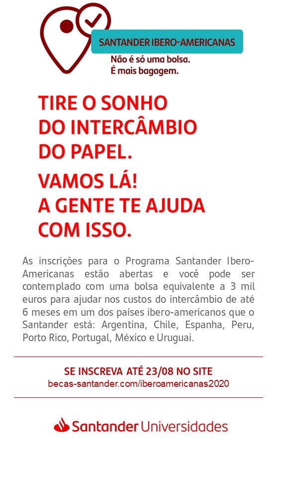 A Assessoria de Intercâmbio Institucional da Universidade Federal de Alagoas divulga que estão abertas as inscrições para o programa Santander Universidades Bolsas Ibero-Americanas para estudantes de graduação. Os alunos interessados podem se inscrever até o dia 23 de agosto para bolsas ibero-americanas e até o dia 17 de maio para bolsas Santander Colders, não vinculadas exclusivamente a faculdade.
