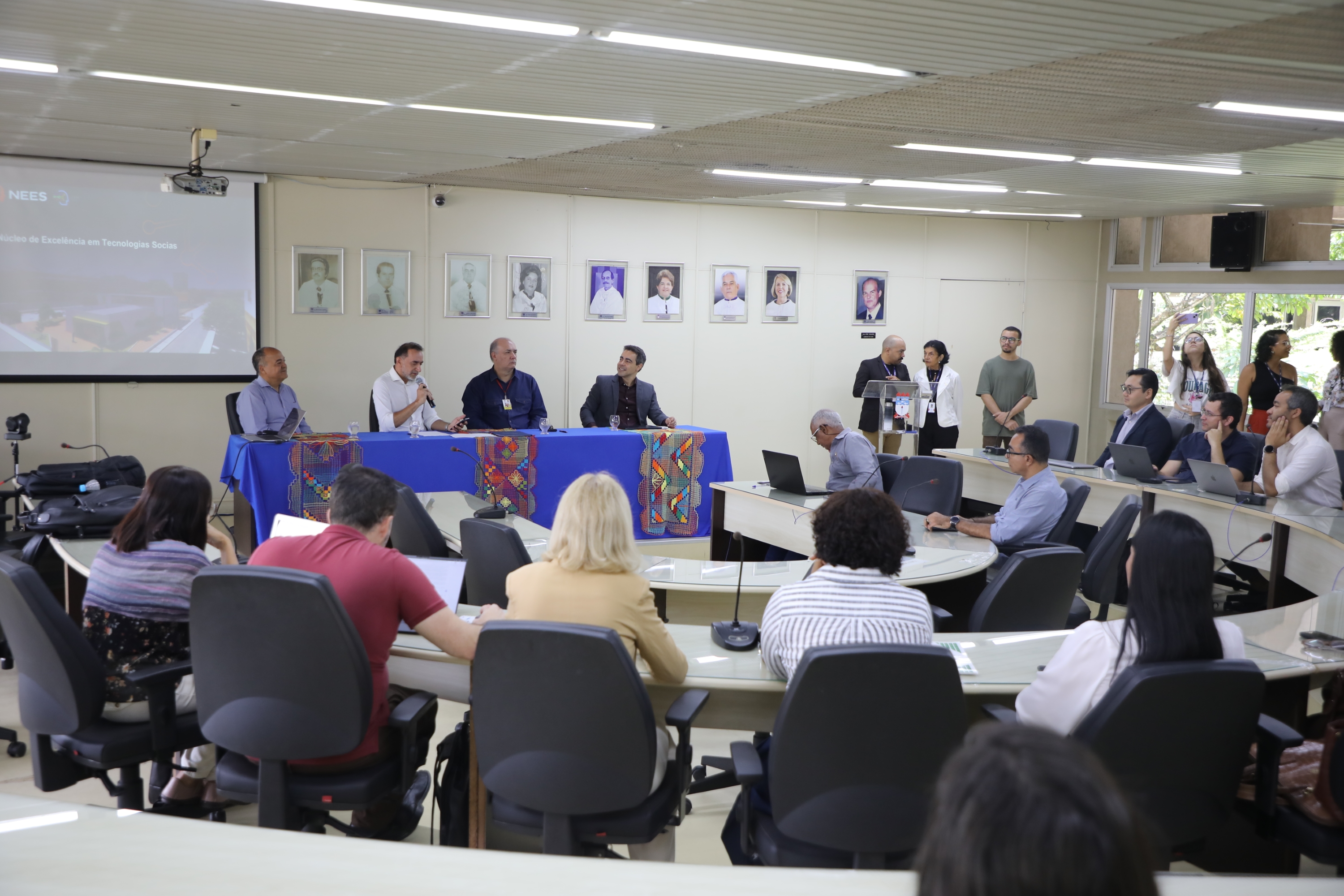 Após, os presentes se dirigiram para a sala do Conselho Universitário (Consuni), onde participaram da mesa de honra Josealdo Tonholo, Carlos Guedes, Edmilson Gomes e o coordenador geral do Nees Ifal, Flávio Medeiros, que destacaram a importância do dia para a educação e pesquisa.