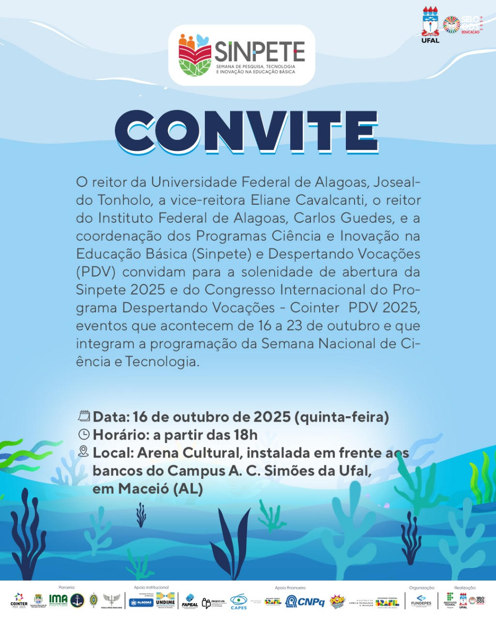 Realizada desde 2022 pela Universidade Federal de Alagoas (Ufal), a Semana Sinpete conta, em 2025, com a coexecução do Instituto Federal de Alagoas (Ifal) e a organização da Fundação Universitária de Desenvolvimento de Extensão e Pesquisa (Fundepes), em alinhamento direto com as diretrizes e objetivos da 22ª Semana Nacional de Ciência e Tecnologia (SNCT), que também acontece de 21 a 26 deste mês.