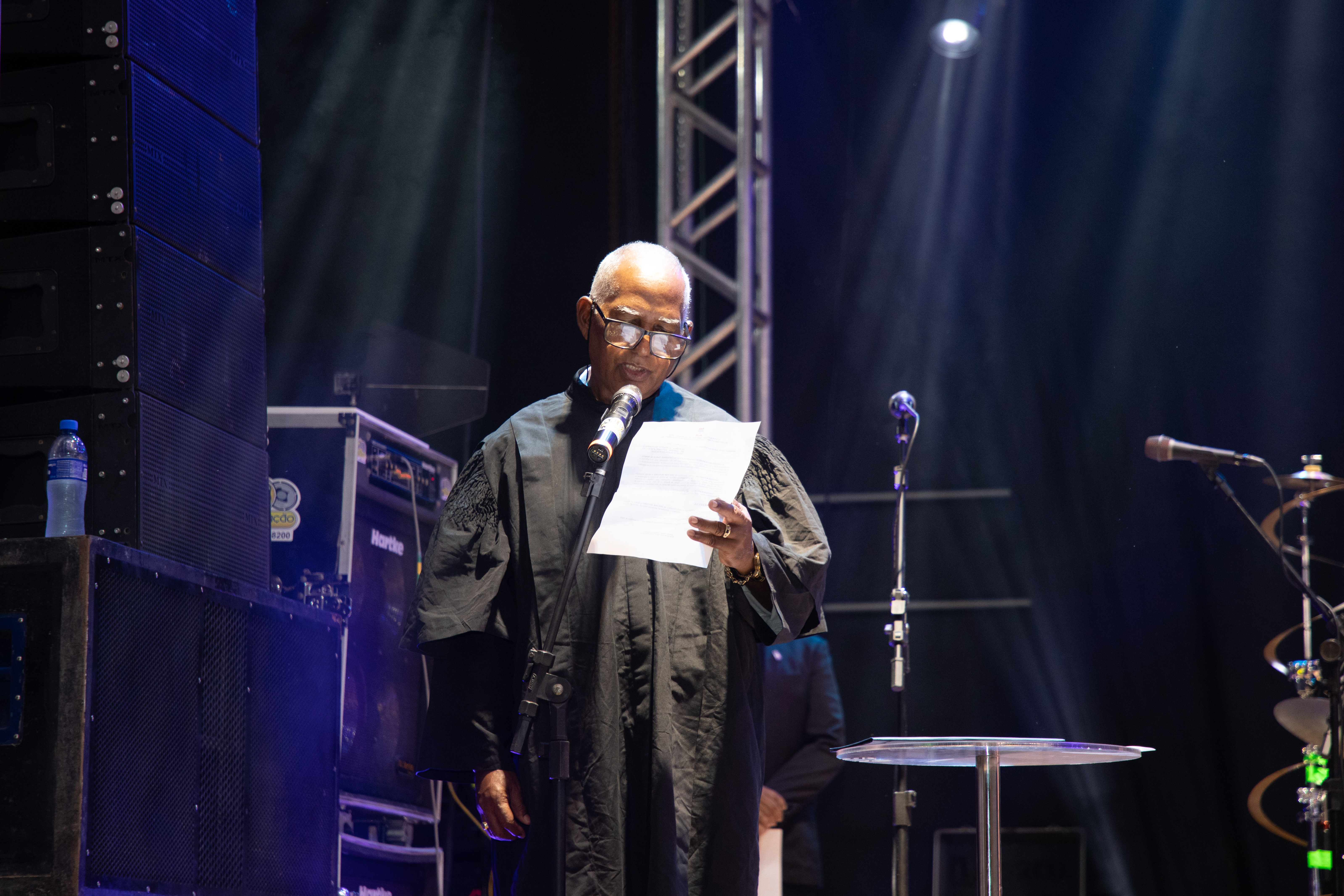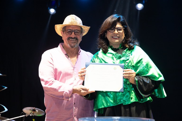 Passeando pela biografia do homenageado, a vice-reitora relembrou que o multi-instrumentista transformava o universo em sons, extraindo acordes de panela, do balde, do copo e, até, do silêncio, ensinando que tudo vibra e, portanto, tudo é música. Para ela, Hermeto foi - e sempre será - um pesquisador da alma sonora brasileira que fez da sua genialidade um território de liberdade, de invenção e de encontro. “Hoje, quando lhe concedemos o título de Doutor Honoris Causa, reconhecemos o seu saber como pleno, legítimo e transformador; aquele que nasce da curiosidade, da escuta e do respeito à natureza da vida. Hermeto nos mostrou que o conhecimento não é um monopólio da academia; ele nasce do povo, da experiência, da intuição e do improviso. Este título é, portanto, uma a homenagem da universidade, à genialidade que não se aprende nos livros, mas que ao mesmo tempo, nos ensinam o que muitas vezes nenhum livro é capaz de dizer”, enfatizou.