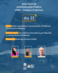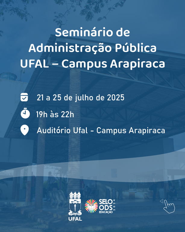 O curso de Administração Pública da Universidade Federal de Alagoas (Ufal) promove na próxima semana, de 21 a 25 (segunda a quarta-feira), o Seminário de Administração Pública, no auditório do Campus Arapiraca.