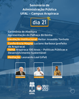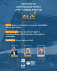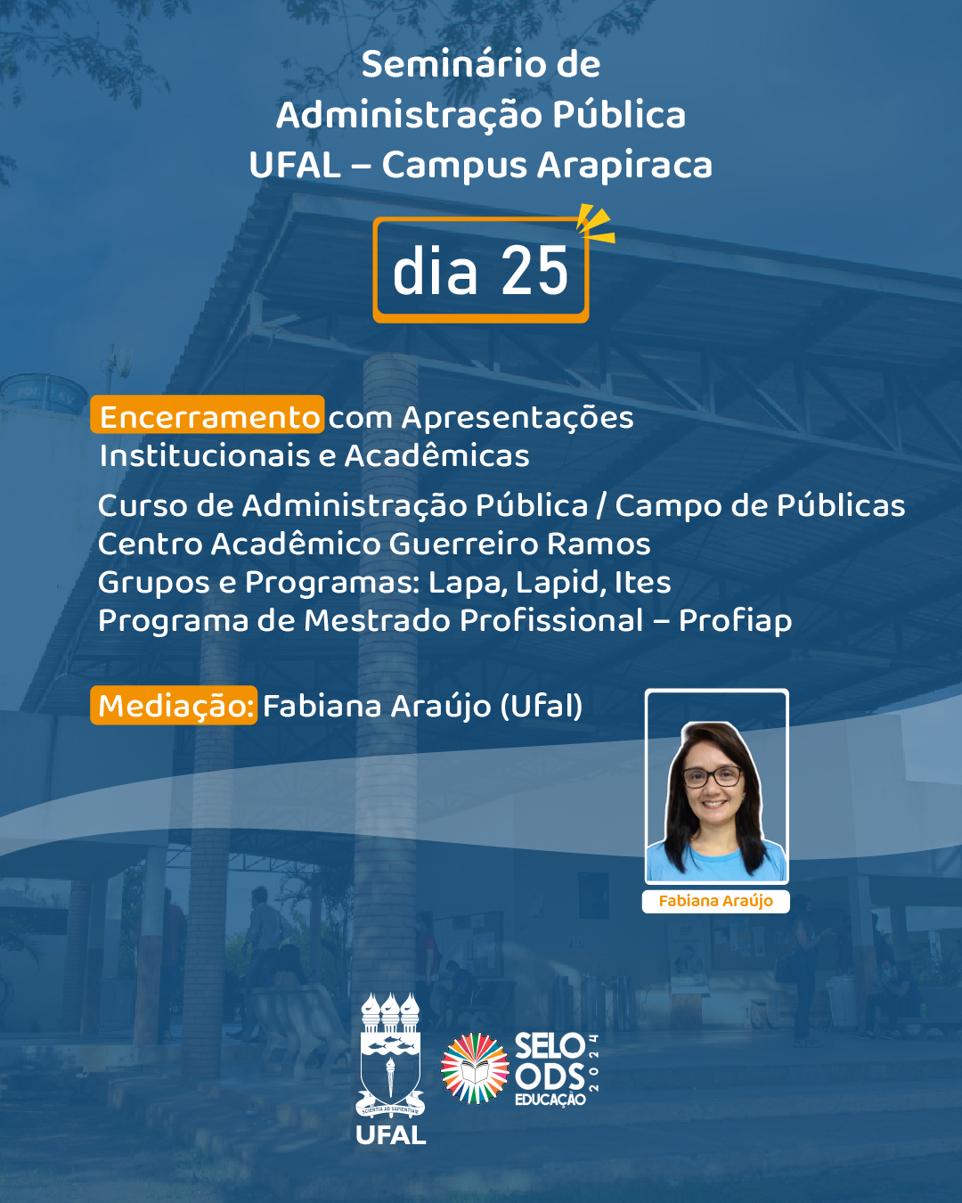 O encerramento, na sexta-feira (25), será dedicado à apresentação de experiências institucionais e acadêmicas, com participação do Curso de Administração Pública, Centro Acadêmico Guerreiro Ramos, Grupos e Programas de Pesquisa (Lapa, Lapid, Ites) e do Programa de Mestrado Profissional em Administração Pública (Profiap).