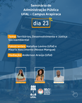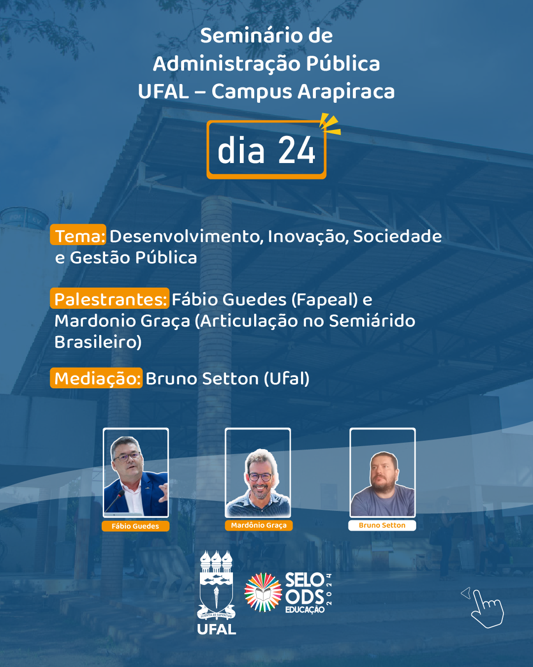A mediação dos debates será feita pelos professores Rodrigo Pereyra, Anderson Araújo, Bruno Setton e Fabiana Araújo. A programação também inclui visita técnica à Associação de Agricultores de Arapiraca, marcada para a tarde de quarta-feira (23/07), reforçando a conexão entre teoria e prática no campo da administração pública.