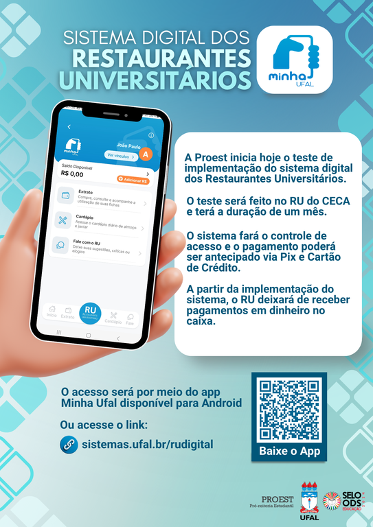 “Na hora de pegar a refeição, basta o usuário se identificar no caixa e o valor é debitado, automaticamente, do seu saldo. É possível também acompanhar pelo sistema o saldo e o histórico de uso de créditos. No aplicativo Minha Ufal, será possível conferir o cardápio do dia”, detalhou Alex.