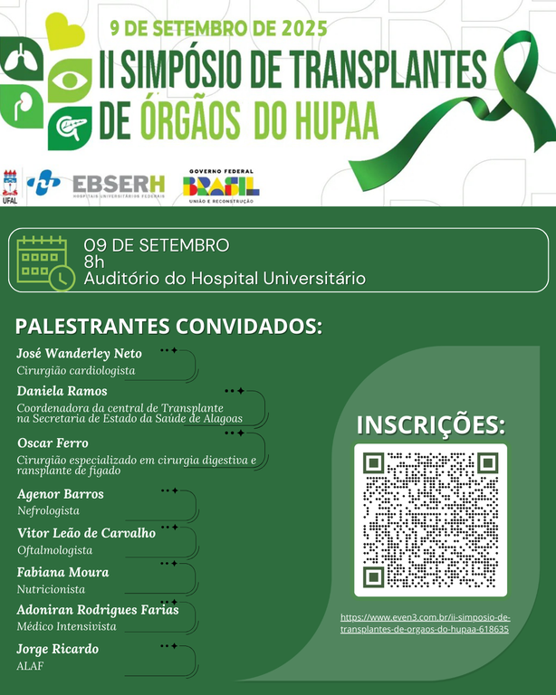 Como parte das ações de apoio à causa, o HU realiza, na terça-feira (9), o II Simpósio de Transplantes, com uma programação rica que inclui palestras de especialistas, discussões interdisciplinares e reflexões sobre os avanços, desafios e conquistas da prática transplantadora.