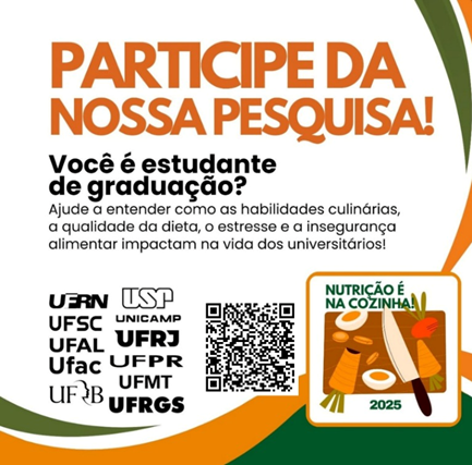 A rotina universitária muda hábitos, encurta o tempo para cozinhar, afeta a qualidade da alimentação e pode até aumentar os níveis de estresse. Para compreender melhor esse cenário entre os estudantes de graduação, a Universidade Federal de Alagoas está convidando a comunidade acadêmica a participar da pesquisa multicêntrica Nutrição é na Cozinha! – 2ª edição, que investiga como habilidades culinárias, qualidade da dieta, estresse percebido e insegurança alimentar se relacionam na vida de universitários.